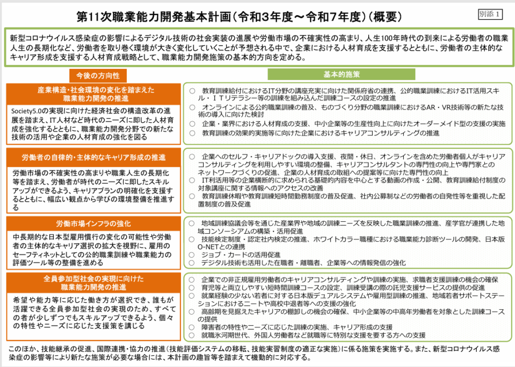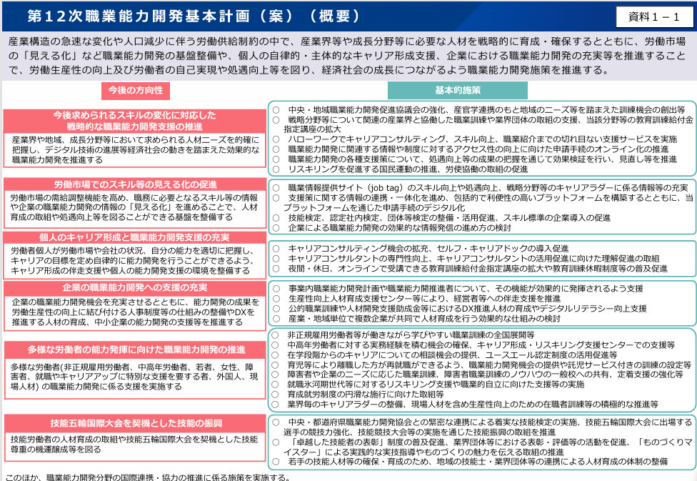 国には5カ年計画があって、その方針に沿いながら、助成金や補助金を含むさまざまな事業を組み立て、制度設計を工夫し、世の中をより良くしようとしている。職業能力開発基本計画もその一つだ。今回、第11次の計画は2025年度、つまり2026年3月31日で一区切りになる。そして2026年度、つまり4月1日から新たな5カ年計画が始まる。それが第12次だ。